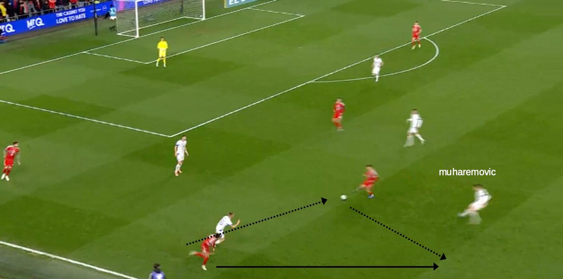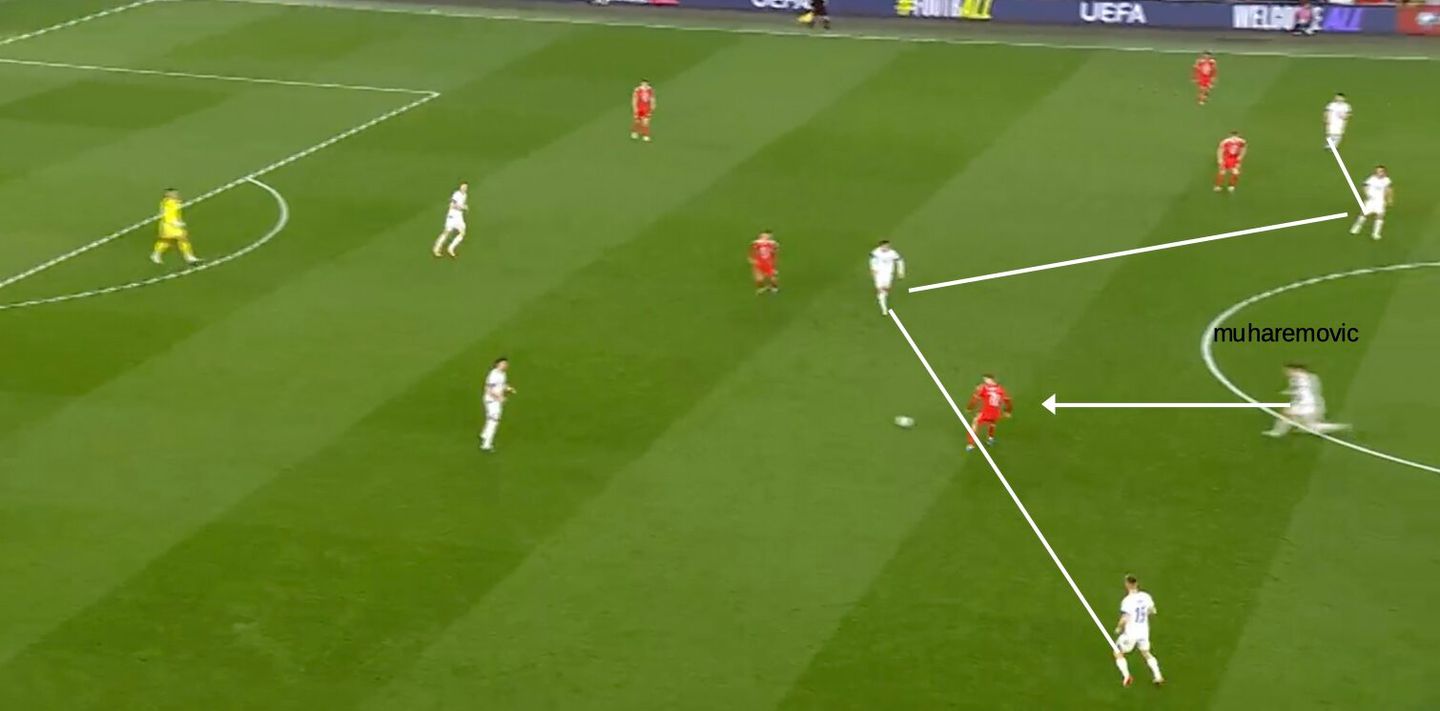 Un atteggiamento del genere, ovviamente, non è esente da rischi. Muharemović, a livello individuale, ha giocato una grande partita. Il Galles, però, delle volte è riuscito ad approfittare del buco che lasciava in difesa trovando l’uomo alle sue spalle.
