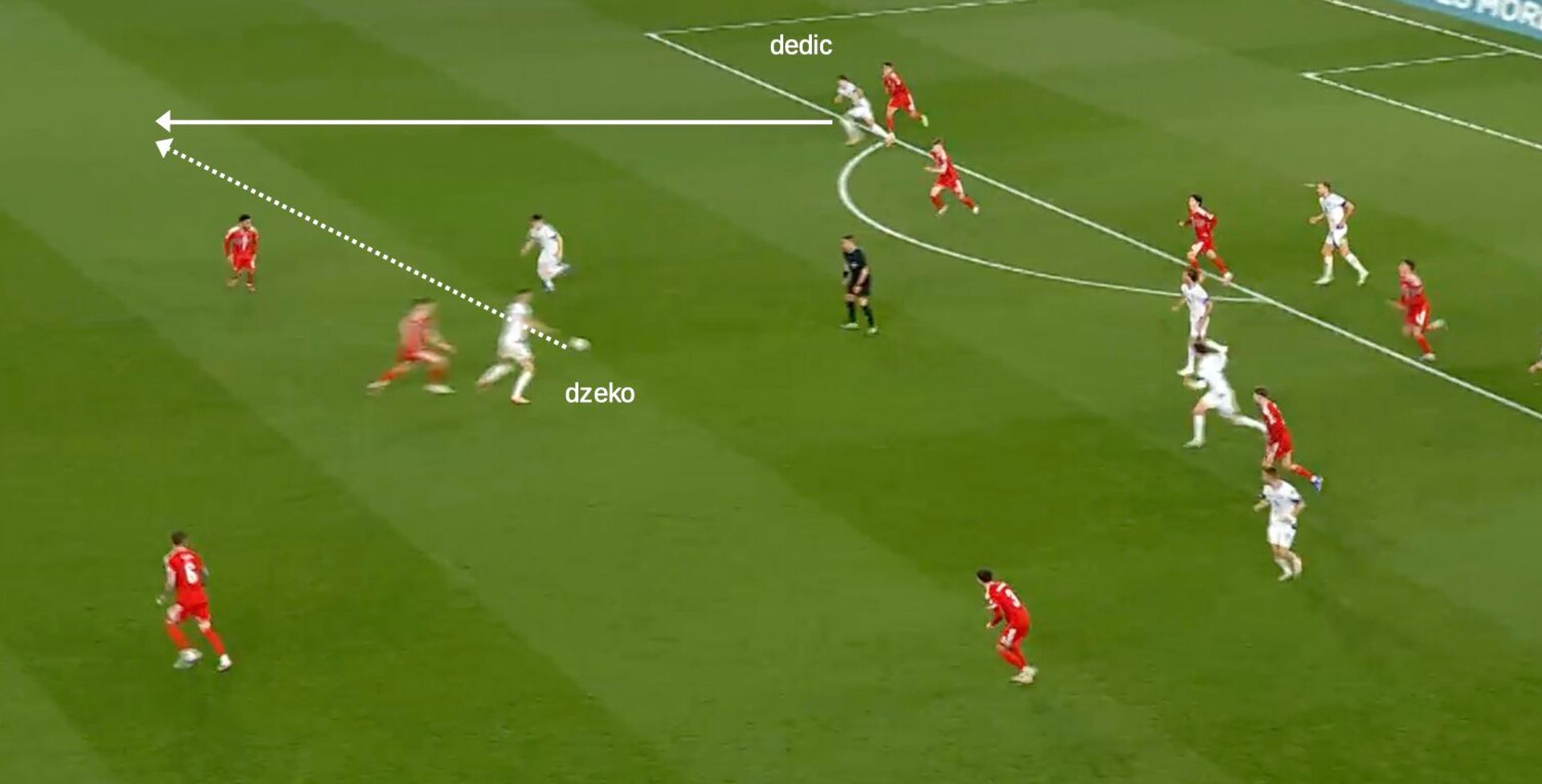 La Bosnia sa essere molto pericolosa a campo aperto. Come detto, è una squadra con alette veloci ed estrose e con un attaccante di grande lettura degli spazi come Demirović. L’elemento che però porta su tutt’altro livello le ripartenze bosniache, e dovremmo saperlo, è Edin Dzeko. Quando si tratta di muoversi incontro per smistare il pallone e decidere come dovrà svilupparsi la transizione, l’ex attaccante di Roma, Inter e Fiorentina sa ancora fare la differenza.