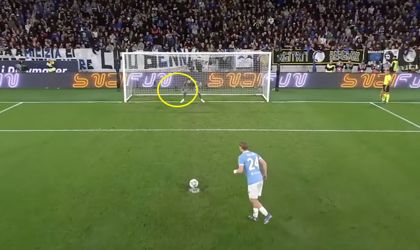 A questo punto, se Zappacosta segna il suo rigore, l’Atalanta va sul 2-0 e la pressione sul tiratore laziale, dopo, diventerebbe ancora più forte. Ma è qui che Edoardo Motta ha un colpo di genio. Prova un altro trucchetto percettivo, ma diverso da quello di prima. Anziché farsi tutto grosso, si fa grosso solo da un lato. Alza un braccio, il destro, sperando che la retina di Zappacosta registri l’informazione, come quando con la visione laterale siamo in grado di schivare un pedone che ci attraversa la strada davanti all’improvviso.