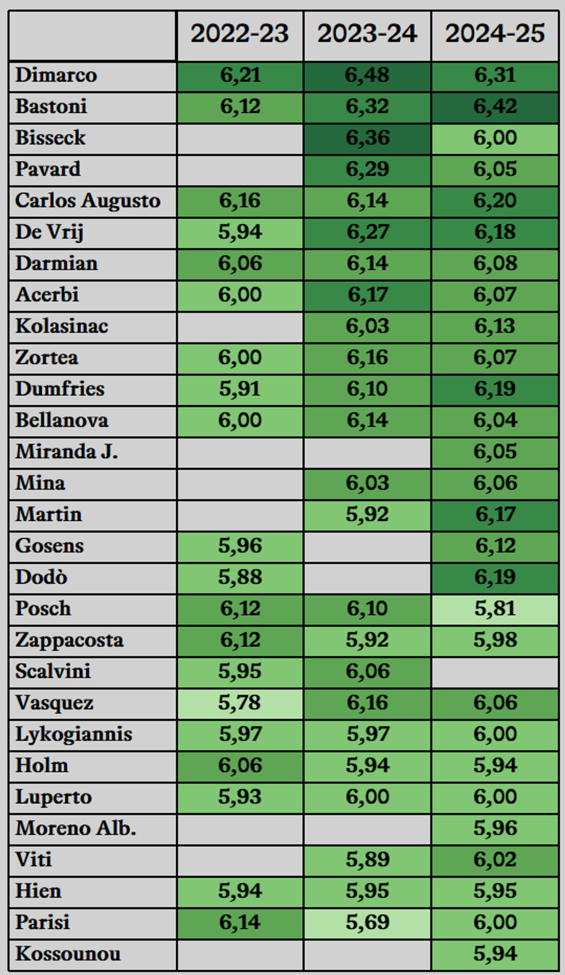 L’ultimo giorno di mercato l’Inter ha praticamente sostituito Pavard con Akanji. A prescindere dalle valutazioni tecniche, fantacalcisticamente questa mossa lascia la situazione più o meno invariata, nel senso che lo svizzero prende esattamente il posto del francese anche nelle valutazioni: dovrebbe essere titolare come braccetto destro - auspicabilmente con una migliore integrità fisica - tenendo conto della rivalità di Bisseck, che però si sta impegnando per non scalare le gerarchie. Parliamo insomma di un difensore affidabile per il modificatore, che probabilmente non troverà molti bonus. Verso fine mercato è arrivato anche Diouf, un acquisto un po’ strano e di cui ancora non si è visto praticamente nulla. Mi sembra un nome su cui non vale la pena rischiare troppo: l’Inter ha diversi centrocampisti e per ora quello in rampa di lancio sembra Sucic, senza dimenticare Frattesi, di cui non sappiamo che considerazione avrà Chivu una volta tornato disponibile. In più Diouf non ha uno storico particolarmente invitante, non avendo segnato molto, e sempre meno rispetto agli xG accumulati. A proposito di Sucic, occhio: serve mantenere equilibrio nella sua valutazione, senza eccessi dopo la prova scintillante col Torino e nemmeno per gli errori con l’Udinese. Sembra comunque un giocatore che avrà tanto spazio in una squadra sulla carta affidabile