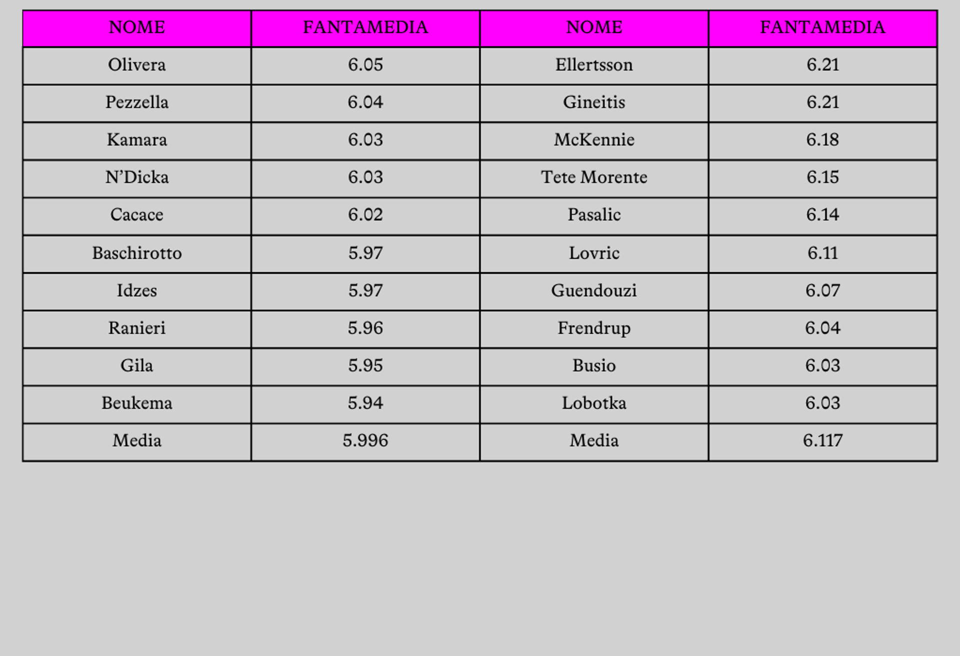 Le tabelle per fasce del Fanta o tier list se siete professionali sono un strumento utile da prendere come riferimento. Non devono però essere una Bibbia. Usate la nostra, confrontatela con altre, ma principalmente costruitevi la vostra. Se fate il Mantra, ovviamente, dovete tener conto delle sfumature dei ruoli e dei moduli che volete usare (nella guida trovate dei consigli anche per quello), se fate il classico invece potete andare più a compartimenti stagni. Come vi abbiamo ripetuto i centrocampisti che segnano sono una buona soluzione per provare a vincere, ma magari voi siete tipi da centravantoni. Costruite la vostra tabella come piace a voi, questi sono i nostri consigli (anche qui: si aggiorna tutto).