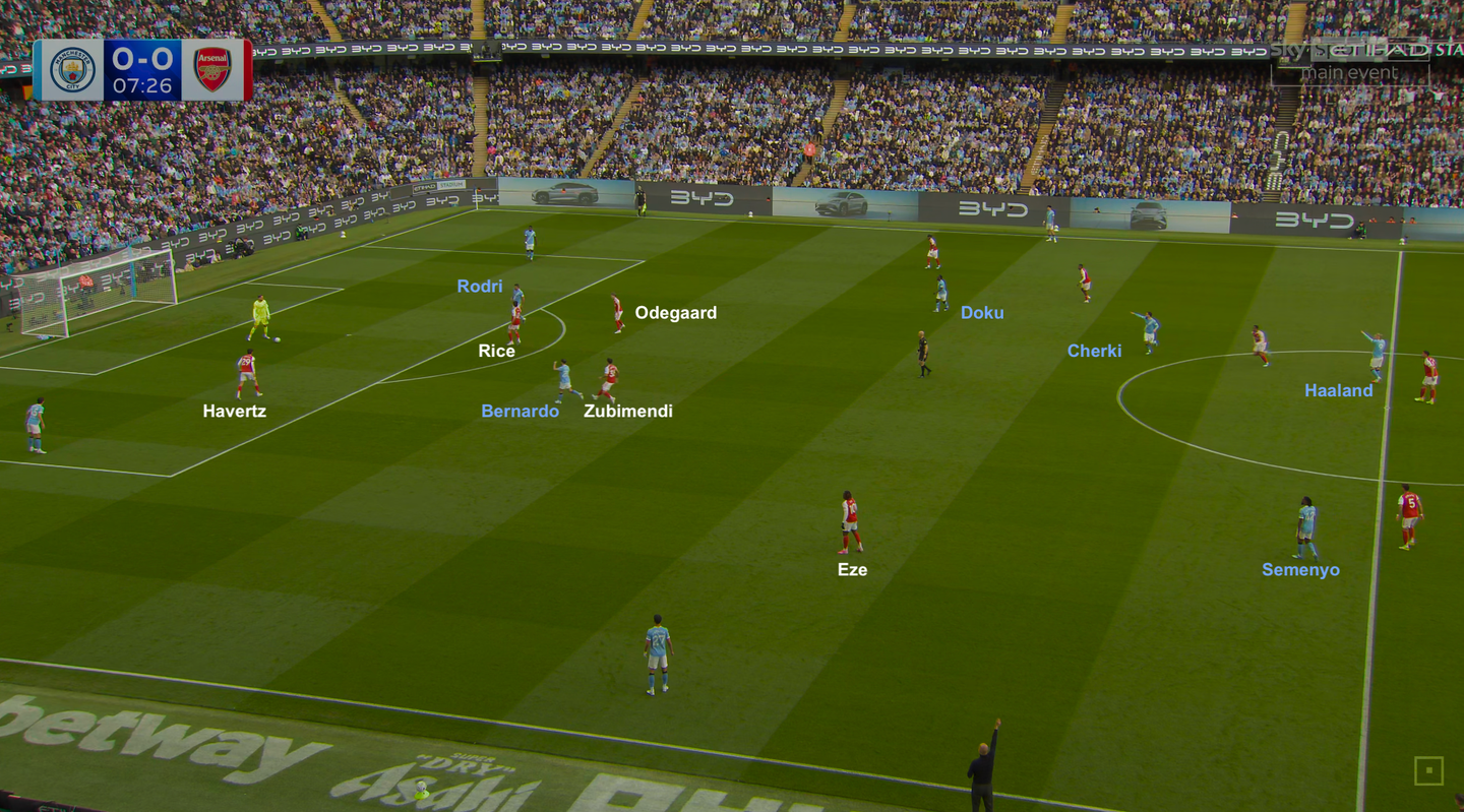 La squadra di Arteta ha provato inizialmente ad aggredire l’uscita palla del City, con Odegaard che saliva al centro mentre Havertz, Eze e Madueke uscivano sui terzini. Anche l’Arsenal, insomma, cercava di spingere la squadra di Guardiola ad andare lungo e saltare il centrocampo, anche se in un modo diverso. Quella dei "Gunners" era una strategia volta al colpire i due vertici degli avversari: le lacune nel gioco con i piedi di Donnarumma; e i limiti di Haaland nella ricezione spalle alla porta e nel riciclo dei palloni sporchi. Inizialmente l’Arsenal ha trovato il modo di imporre un contesto tattico nuovo alla sfida e sembrava poterne trarre la fiducia per portarsi a casa anche il risultato.
