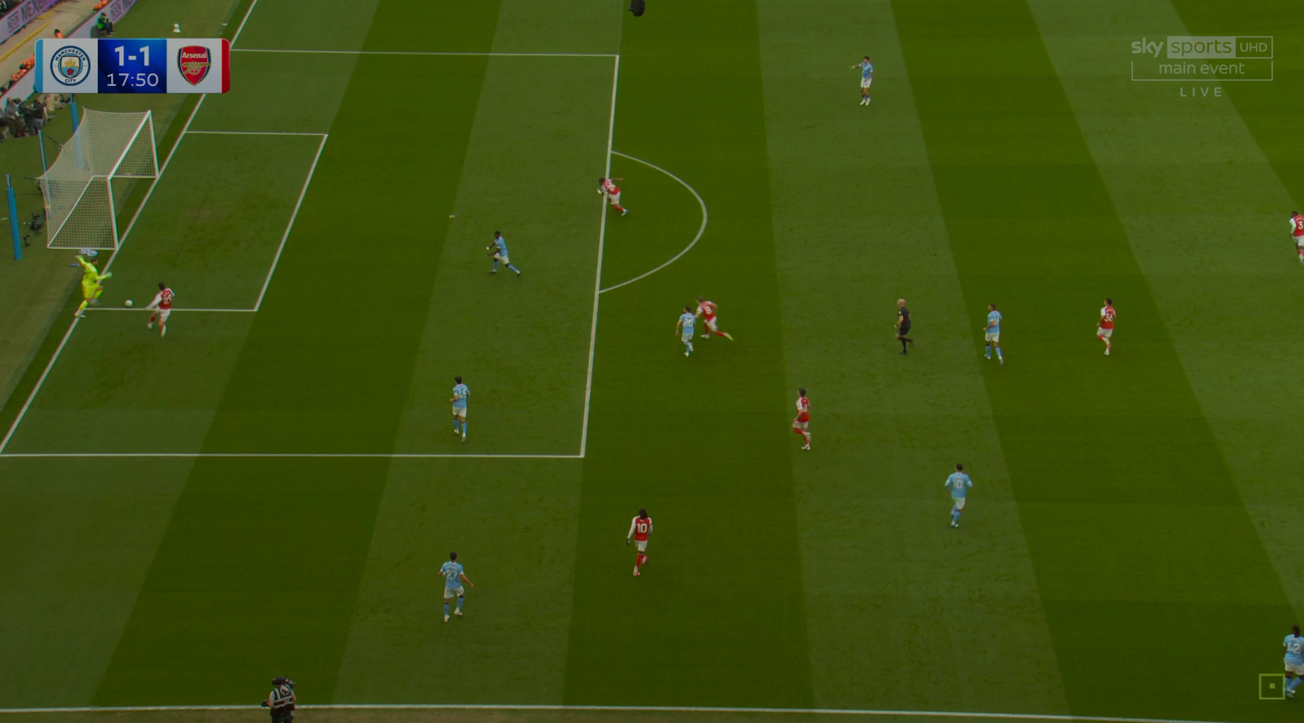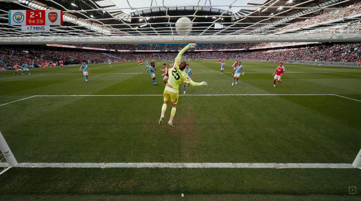 Al minuto 95 l’Arsenal è in svantaggio e ormai nella fase di attacco matto e disperatissimo. Con tutti i giocatori nella metà campo del City, contro una squadra di Guardiola tutta ristretta in pochi metri davanti alla propria area, la palla arriva sull’esterno a Trossard. Il belga controlla, alza la testa e mette un cross pulitissimo a centro area per Havertz. Il tedesco si è liberato bene dal marcatore e può impattare senza ostacoli ma la palla finisce di pochissimo alta sopra alla traversa. È la seconda volta che manca una grande occasione per pochi centimetri. L'Etihad tira un sospiro di sollievo e capisce che il peggio è passato e, mentre Havertz sembra inconsolabile, Arteta si butta a terra come per espiare una colpa. I tifosi dell'Arsenal sono inconsolabili.