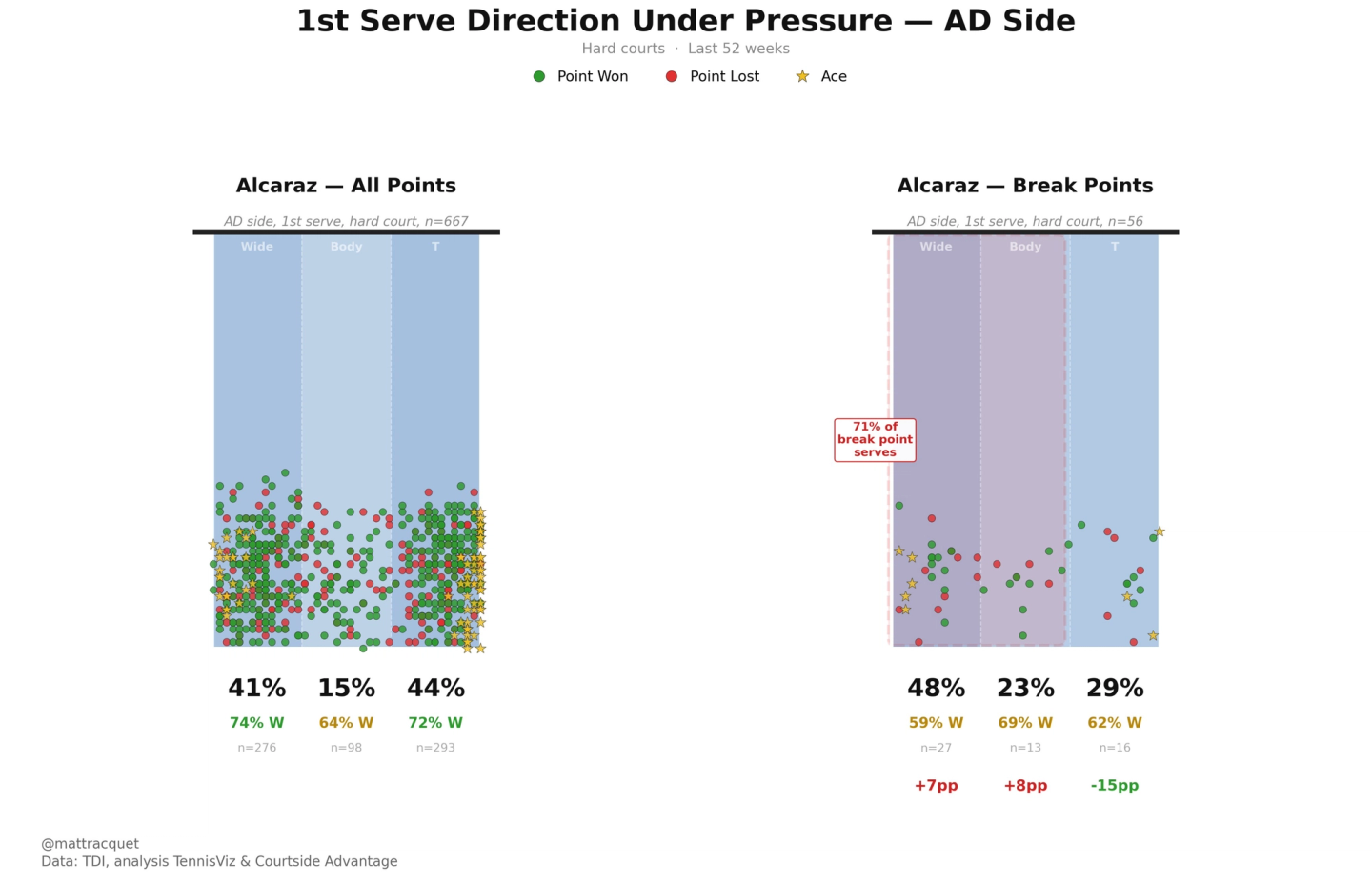 Alcaraz è sempre stato formidabile sulle palle break, che nel tennis si giocano per la maggior parte a sinistra. E Alcaraz, destro, è storicamente forte nell'annullarle per la sua capacità nel servire ad uscire (l'Ad side, in gergo) e aprirsi il campo o per una salita a rete o per un uno-due comodo. La distribuzione dei servizi di Alcaraz è equilibrata quando non sono palle break, mentre sulle palle break è diventato troppo prevedibile, e infatti tira poco più del 70% dei suoi servizi sull'Ad side. Come nota Willis è un porto sicuro, fatto anche per evitare di tirare una seconda, e ovviamente essendo uno dei più forti tennisti della storia tende a cavarsela ugualmente, eseguendo, ma ormai sta diventando troppo prevedibile.